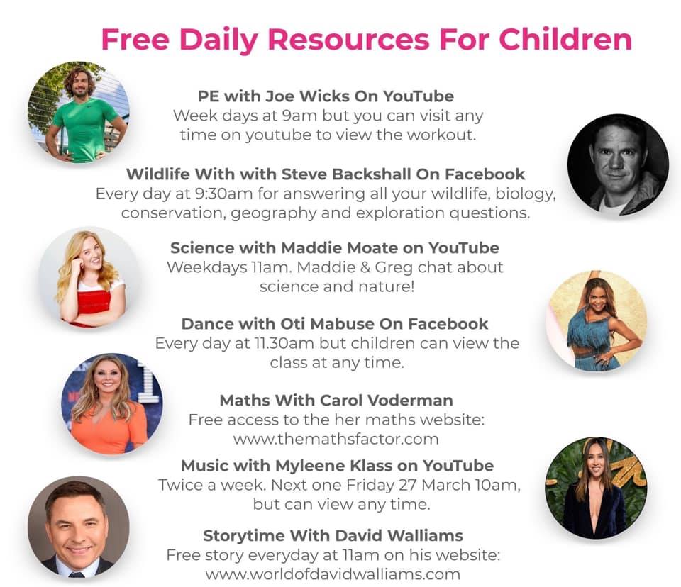 Here is a roundup of some of the home learning resources that have been made available for free by celebrities whilst the schools are closed. They maybe a helpful starting point in building a daily routine, and there should be something there that most students would enjoy: